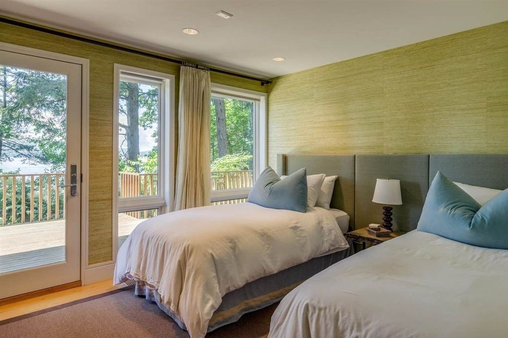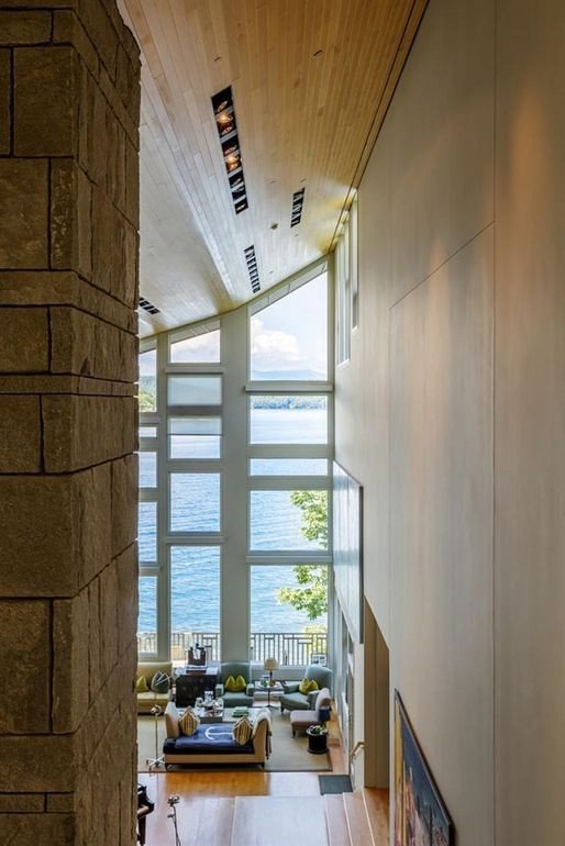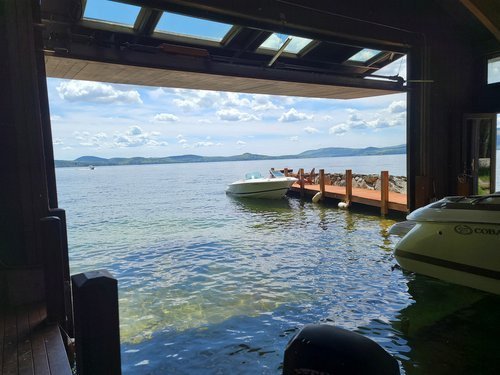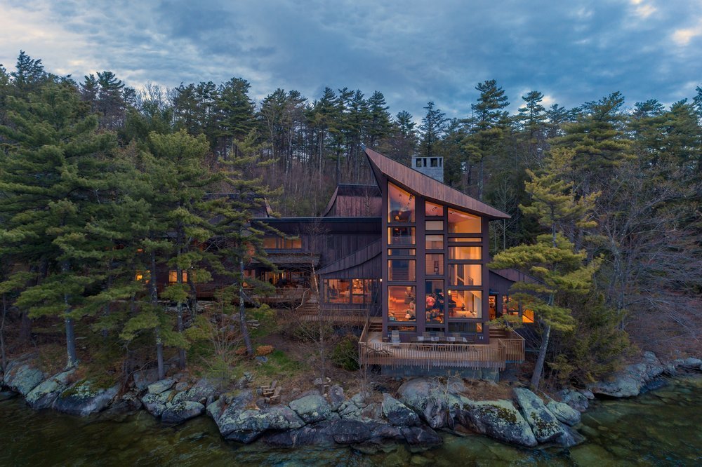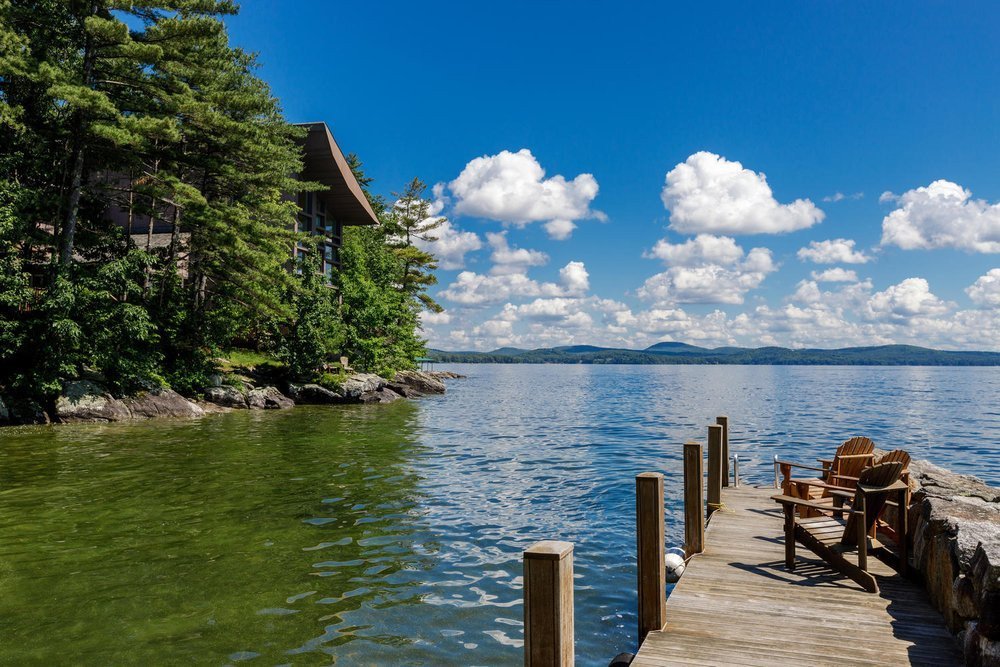 Breathtakingly beautiful and luxurious lakefront home, custom built in Wolfeboro,NH. With 430′ of lake frontage on Lake Winnipesaukee and views from every room, this contemporary styled home is sure to impress. The open and easy living floor plan is perfect for entertaining, with a soundproofed media room, 30’ granite fireplace and massive wall of windows, and gallery lighting in the hallways. The Lutron lighting system throughout the house features scene modes and automatic functions to make life easier. The property features stunning lake and mountain views from the multiple ironwood decks, outdoor hot tub, and swim platforms. The 2-slip custom boat house has an airplane hangar design overhead door system and an additional 45′ dock – perfect for all your water activities. The home also has a home gym, sauna and outdoor spa.