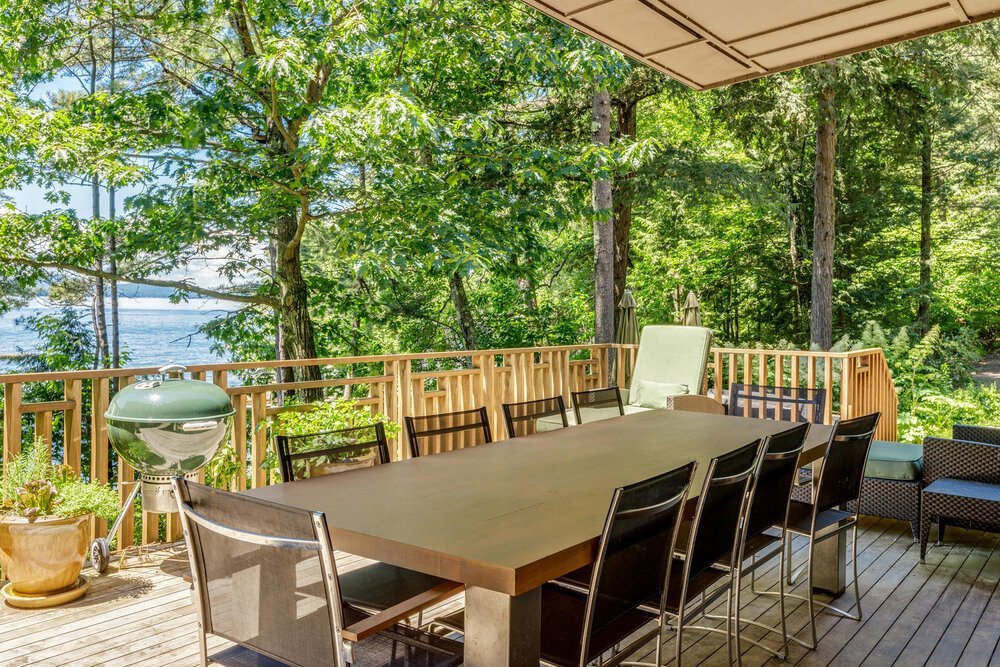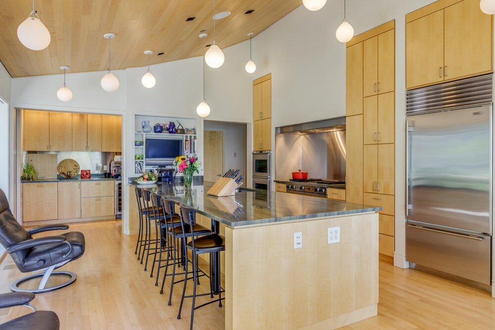 The chef’s kitchen has professional grade appliances and a massive granite island to seat six. Custom maple cabinets and woodwork with a large pantry, wine fridge and endless storage.